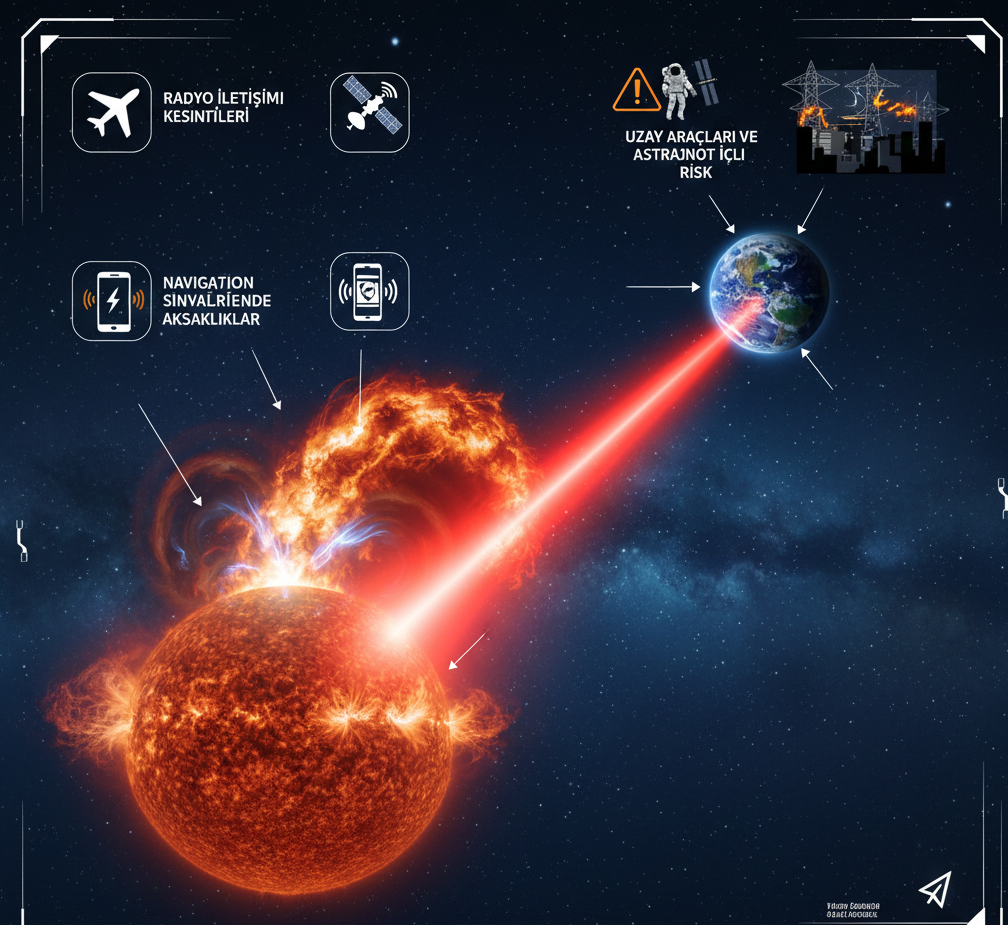 Radyo İletişimi Kesintileri: Patlamalarla yayılan X-ışınları ve ultraviyole radyasyon, Dünya atmosferinin üst katmanlarını iyonize ederek yüksek frekanslı radyo iletişimini bozabilir veya tamamen kesintiye uğratabilir. Özellikle kutup bölgeleri ve havacılık iletişimleri bu durumdan etkilenebilir.