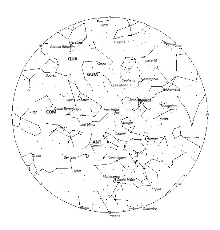 Quadrantidler (QUA) meteor yağmuru 26 Aralık ile 16 Ocak tarihleri arasında aktiftir. Maksimum yoğunluk 3 Ocak'ta gerçekleşmiştir . Radyant şu anda 15:44 (236) +50 konumundadır. Bu konum, kuzey Bootes'in çorak bir bölgesinde, 4. kadir büyüklüğündeki phi Herculis yıldızının 6 derece kuzeybatısında yer almaktadır. Bu meteorlar, karanlık bir gökyüzünde radyantın kuzeydoğu ufkunun en yüksek noktasında olduğu şafaktan önceki son saatte en iyi şekilde görülür. Bulunduğunuz yere bakılmaksızın saatlik oranların 1'den az olması beklenmektedir. Saniyede 39 km hızla Quadrantidler, orta hızda meteorlar üretir. Bu meteorlar güney tropik bölgelerden görülebilir, ancak güney yarımkürenin derinliklerinden görülemez.