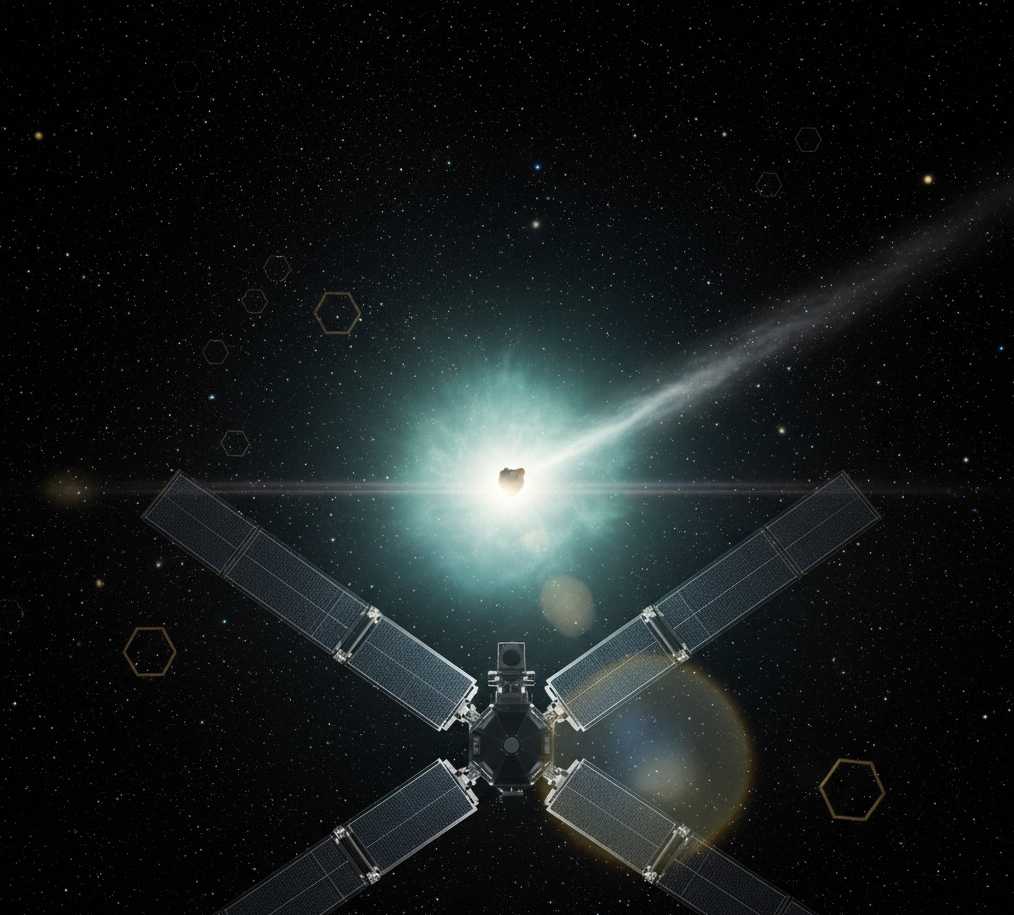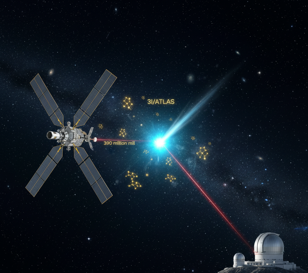 Şimdi, Lucy ve Las Cumbres'ten elde edilen verileri karşılaştırarak, bilim insanları hem kuyruklu yıldızın üç boyutlu yapısını hem de kuyruklu yıldızın tozunun güneş ışığını nasıl saçtığını anlamaya çalışıyorlar. Bu, uzak bir güneş sisteminden gelen eski tozu kendi güneş sistemimizdeki tozla karşılaştırmak için eşsiz ve nadir bir fırsat sunuyor. Bu karşılaştırmalar, gezegenlerin ve kuyruklu yıldızların nasıl oluştuğuna dair evrensel süreçlere ışık tutabilir. Lucy uzay aracı ve Dünya'daki bir gözlemevinin 3I/ATLAS kuyruklu yıldızını farklı açılardan incelemesini gösteren illüstrasyon.